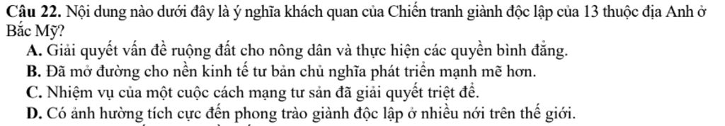`22)` Nội dung nào dưới đây là ý nghĩa khách quan của Chiến tranh giành độc lập của `13` thuộc địa Anh ở Bắc Mỹ?