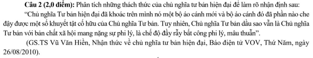 Câu 2 (2,0 điểm): Phân tích những thách thức của chủ nghĩa tư bản hiện đại để làm rõ nhận định sau: “Chủ nghĩa Tư bản hiện đại đã khoác trên mình nó một bộ áo cánh mới và bộ áo cánh đó đã phần nào che đậy được một số khuyết tật cố hữu của Chủ nghĩa Tư bản. Tuy nhiên, Chủ nghĩa Tư bản đầu sao vẫn là Chủ nghĩa Tư bản với bản chất xã hội mang nặng sự phi lý, là chế độ đầy rẫy bất công phi lý, mâu thuẫn”.