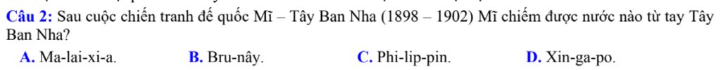 `->` Cuộc chiến tranh Mỹ - Tây Ban Nha từ `1898-1902` đã kết thúc với việc Mỹ đã gạt bỏ được ảnh hưởng của Tây Ban Nha, hoàn thành quá trình xâm lược, biến Phi-lip-pin thành thuộc địa của mình ở khu vực Đông Nam Á.