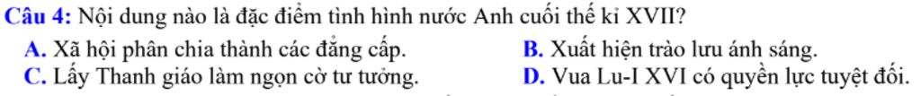 Câu 4: Nội dung nào là đặc điểm tình hình nước Anh cuối thế kỉ `XVII`