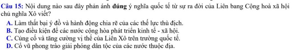 Câu 15: Nội dung nào sau đây phản ánh đúng ý nghĩa quốc tế từ sự ra đời của Liên bang Cộng hoà xã hội chủ nghĩa Xô viết?