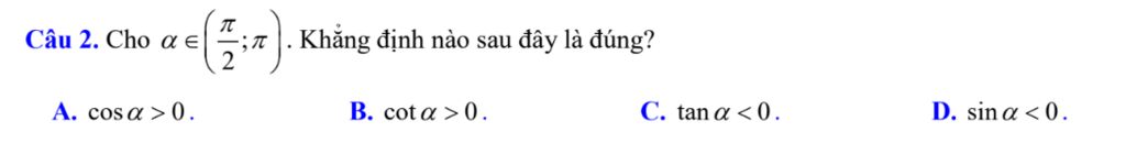 Câu 2. Cho `α ∈(π/2;π)`. Khẳng định nào sau đây là đúng?