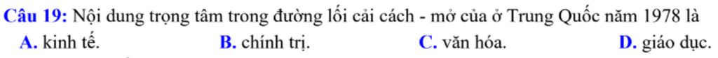 `->` Nội dung trọng tâm trong đường lối cải cách - mở cửa ở Trung Quốc năm 1978 là kinh tế. Các cải cách chủ yếu tập trung vào việc chuyển đổi sang nền kinh tế thị trường, thu hút đầu tư nước ngoài và cải thiện năng suất.