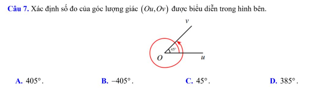 Câu 7: Xác định số đo của góc lượng giác (Ou, Ov) được biểu diễn trong hình bên: