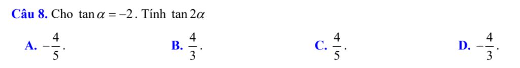 Câu 8. Cho `tanα =−2`. Tính `tan2α`