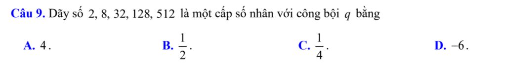 Câu 9. Dãy số 2, 8, 32, 128, 512 là một cấp số nhân với công bội q bằng