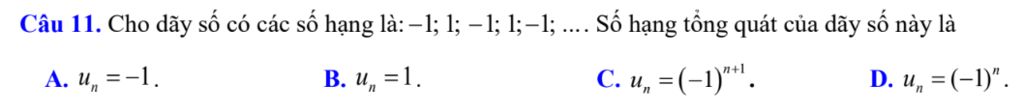 Câu 11. Cho dãy số có các số hạng là: −1; 1; −1; 1; −1; .... Số hạng tổng quát của dãy số này là