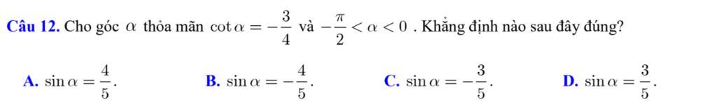 Câu 12. Cho góc α thỏa mãn `cotα = -3/4 `và `-π/2<α< 0` . Khẳng định nào sau đây đúng?