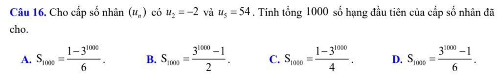 Câu 16. Cho cấp số nhân (`u_n`) có `u_2 =−2` và `u_5 =54 `. Tính tổng 1000 số hạng đầu tiên của cấp số nhân đã cho.