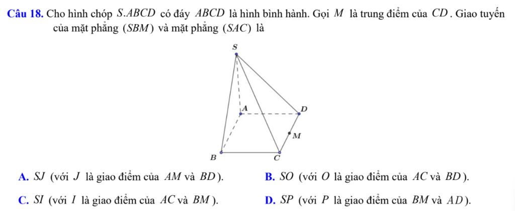 Câu 18. Cho hình chóp S.ABCD có đáy ABCD là hình binh hành. Gọi M là trung điểm của CD, Giao tuyến của mặt phẳng (SBM) và mặt phẳng (SAC) là