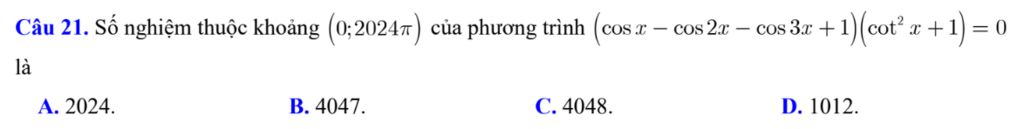 Câu 21. Số nghiệm thuộc khoảng `(0;2024π)` của phương trình` (cosx-cos2x-cos3x+1).(cot²x+1)=0` là