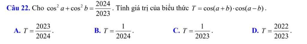 Câu 22. Cho `cos²a+cos²b=2024/2023.` Tính giá trị của biểu thức T= `cos(a+b.cos(a−b)`