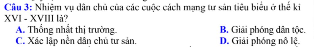 GT:Các cuộc cách mạng tư sản tiêu biểu ở thế kỉ XVI - XVIII chủ yếu nhằm mục đích thiết lập các quyền tự do và quyền lực cho giai cấp tư sản, từ đó xác lập nền dân chủ tư sản.