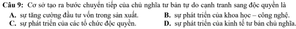 `+` Cơ sở tạo ra bước chuyển tiếp của chủ nghĩa tư bản tự do cạnh tranh sang độc quyền là sự phát triển của các tổ chức độc quyền.
