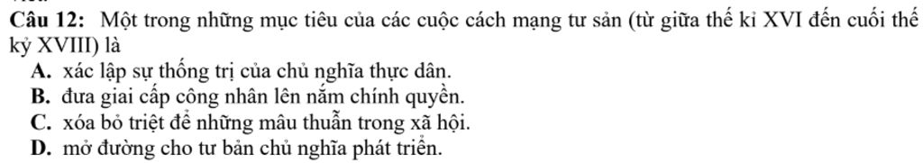 `-` Một trong những mục tiêu của các cuộc cách mạng tư sản (từ giữa thế kỉ `XVI` đến cuối thế kỷ `XVIII`) là: