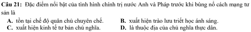 `21)` Đặc điểm nổi bật của tình hình chính trị nước Anh và Pháp trước khi bùng nổ cách mạng tư sản là