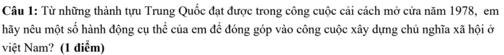 Câu 1: Từ những thành tựu Trung Quốc đạt được trong công cuộc cải cách mở cửa năm 1978, em hãy nêu một số hành động cụ thể của em để đóng góp vào công cuộc xây dựng chủ nghĩa xã hội ở Việt Nam? (1 điểm)