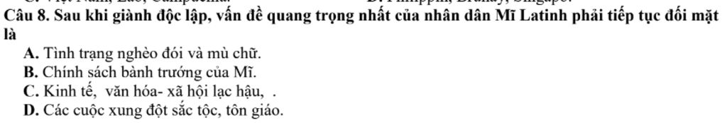 `-` Giải thích: Sau khi giành độc lập, các quốc gia Mĩ Latinh vẫn phải đối mặt với chính sách can thiệp và bành trướng của Hoa Kỳ, thông qua việc ủng hộ các chế độ độc tài và chi phối kinh tế, chính trị trong khu vực nhằm bảo vệ lợi ích của Mỹ.