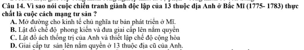 `-` Giải thích: Cuộc chiến tranh giành độc lập của 13 thuộc địa Anh ở Bắc Mĩ thực chất là cuộc cách mạng tư sản, vì nó không chỉ lật đổ sự thống trị của Anh mà còn dẫn đến việc thiết lập một chính phủ cộng hòa, phản ánh các giá trị tư sản như tự do và bình đẳng.