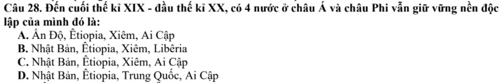 Đến cuối thế kỉ XIX - đầu thế kỉ XX, có 4 nước ở châu Á và châu Phi vẫn giữ vững nền độc lập của mình đó là Nhật Bản, Êtiopia, Xiêm, Libêria