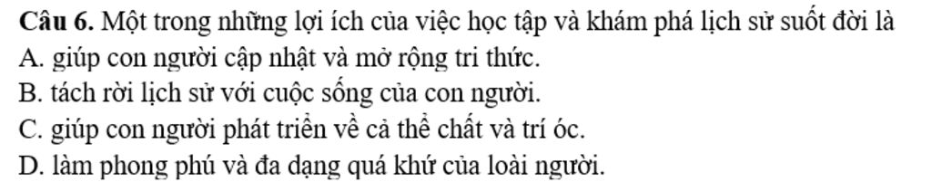 `Câu 6:` Một trong những lợi ích của việc học tập và khám phá lịch sử suốt đời là :