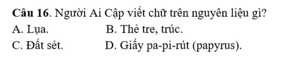 `->` Người Ai Cập viết chữ trên nguyên liệu giấy pa-pi-rút được lấy từ cây papyrus mọc ở vùng đồng bằng sông Nile.