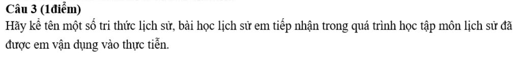 Câu `3`: Hãy kể tên một số tri thức lịch sử, bài học lịch sử em tiếp nhận trong quá trinhg học tập môn lịch sử đã được em vận dụng vào thực tiễn: