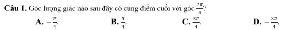 Câu 1. Góc lượng giác nào sau đây có cùng điểm cuối với góc `(7π)/4` ?