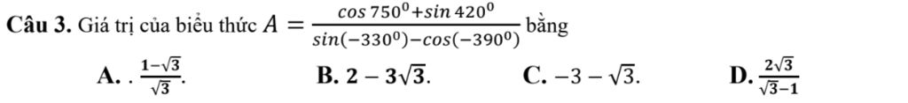 Câu 3. Giá trị của biểu thức A =`(cos750°+sin420°)/(sin(-330°)-cos(-390°))` bằng: