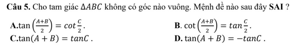 Câu 5. Cho tam giác AABC không có góc nào vuông. Mệnh đề nào sau đây SAI?