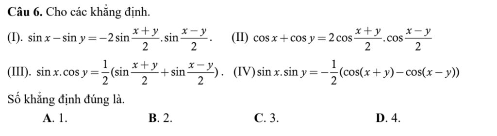 (III). sinx.cosy =` 1/2(sin(x+y)/2 +sin(x-y)/2). (IV). sinx.sin y = -1/2(cos(x+y)-cos(x-y)`