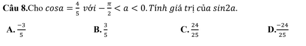 Câu 8.Cho` cosa=4/5` với `-π/2<a<0`. Tính giá trị của sin2a.