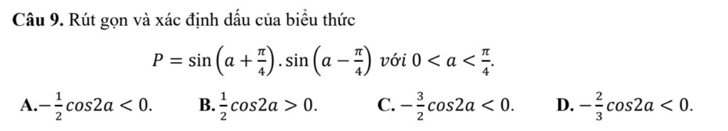 Câu 9. Rút gọn và xác định dấu của biểu thức P =`sin(a + π/4).sin(a - π/4)` với `0<a<π/4`