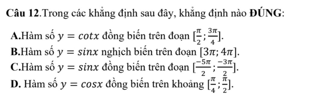 D. Hàm số y = cosx đồng biến trên khoảng `(π/4;π/2).`