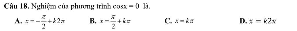 Câu 18. Nghiệm của phương trình cosx=0 là.