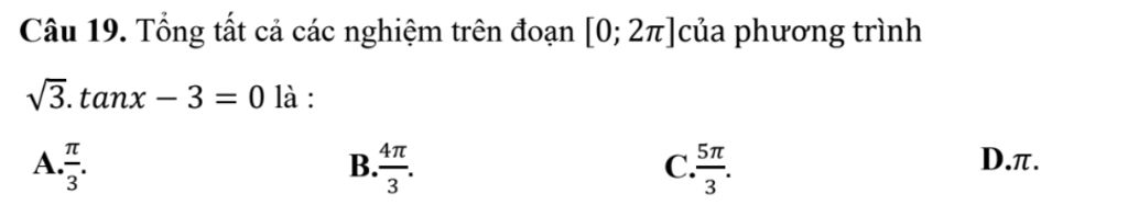 Câu 19. Tổng tất cả các nghiệm trên đoạn [0; 2π] của phương trình` (√3) .tanx–3=0` là :