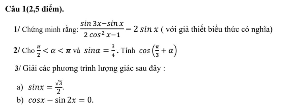 1/ Chứng minh rằng:`(sin 3x-sin x)/(2 cos²x-1) = 2sinx` với giả thiết biểu thức có nghĩa)