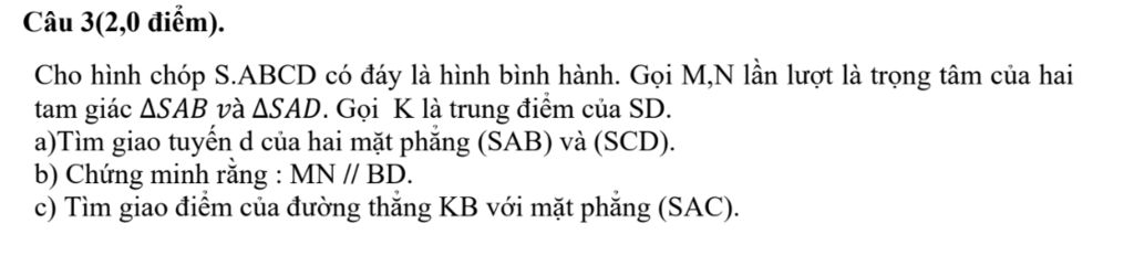 Câu 3(2,0 điểm). Cho hình chóp S.ABCD có đáy là hình bình hành. Gọi M,N lần lượt là trọng tâm của hai tam giác SAB và SAD. Gọi K là trung điểm của SD.