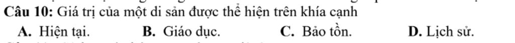 Câu `10`: Gía trị của một di sản được thể hiện trên khía cạnh: