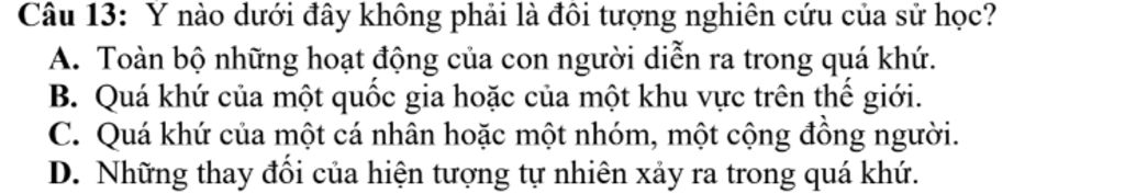 Ý nào dưới đây không phải là đối tượng nghiên cứu của sử học?