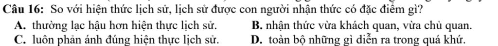 `16)` So với hiện thức lịch sử, lịch sử được con người nhận thức có đặc điểm gì?