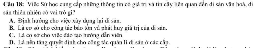 Câu `18`: Việc sử dụng cung cấp những thông tin có giá trị và tin cậy liên quan đến si sản văn hóa, di sản thiên nhiên có vai trò: