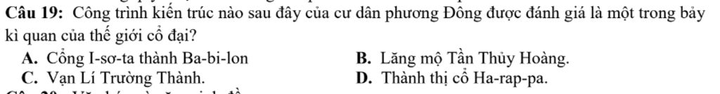 `->` Cổng I-sơ-ta là một trong những biểu tượng nổi bật của nền văn minh Babylon và được công nhận là một trong những kỳ quan cổ đại. Các lựa chọn khác như Lăng mộ Tần Thủy Hoàng, Vạn Lý Trường Thành, và Thành phố cổ Ha-rap-pa không nằm trong danh sách bảy kỳ quan cổ đại.