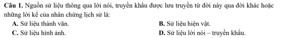 `-` Lý do : Sử liệu lời nói `-` truyền khẩu là nguồn sử liệu qua lời nói và truyền khẩu, bao gồm những câu chuyện truyền thuyết, cổ tích, `...` được lưu truyền trong nhân gian từ đời này qua đời khác hay những lời kể của nhân chứng lịch sử.