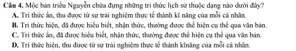 `-` Lý do : Mộc bản triểu Nguyễn chứa đựng những tri thức lịch sử thuộc tri thức hiện, đã được hiểu biết và nhận thức, thường được thể hiện cụ thể qua văn bản. Được thể hiện qua việc `UNESCO` công nhận Mộc bản triểu Nguyễn là di sản tư liệu thế giới đầu tiên tại Việt Nam.