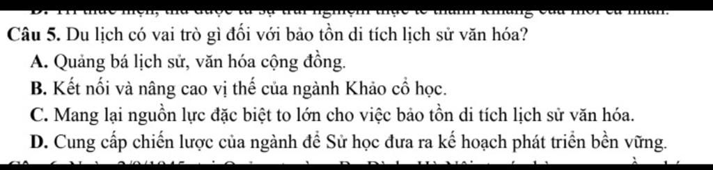 Câu 5. Du lịch có vai trò gì đối với bảo tồn di tích lịch sử văn hóa?