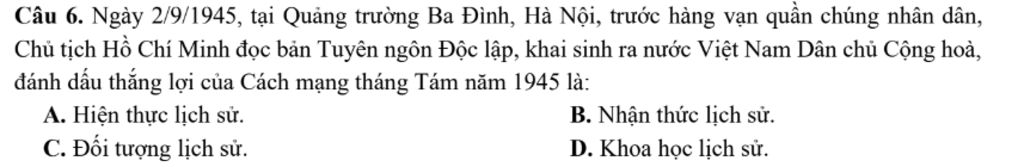 `-` Lý do : Ngày `2` `/` `9` `/` `1945`, tại Quảng trường Ba Đình, Hà Nội, Chủ tịch Hồ Chí Minh đọc bản Tuyên ngôn Độc lập, khai sinh ra nước Việt Nam Dân chủ Cộng hoà, đánh dấu thắng lợi của Cách mạng tháng Tám năm `1945` chính là thực hiện lịch sử. Hiện thực lịch sử là tất cả những thứ gì diễn ra trong quá khứ, tồn tại hoàn toàn, không phụ thuộc vào ý chí chủ quan của con người và cũng không thể thay đổi được.