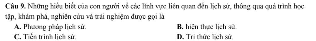 `->` Tri thức lịch sử đề cập đến những hiểu biết mà con người có được về lịch sử qua học tập, khám phá, nghiên cứu và trải nghiệm.