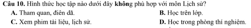 Câu 10. Hình thức học tập nào dưới đây không phù hợp với môn Lịch sử?