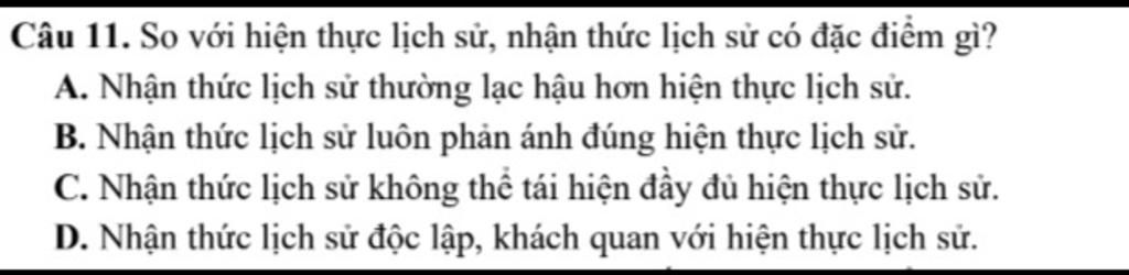 Câu 11. So với hiện thực lịch sử, nhận thức lịch sử có đặc điểm gì?